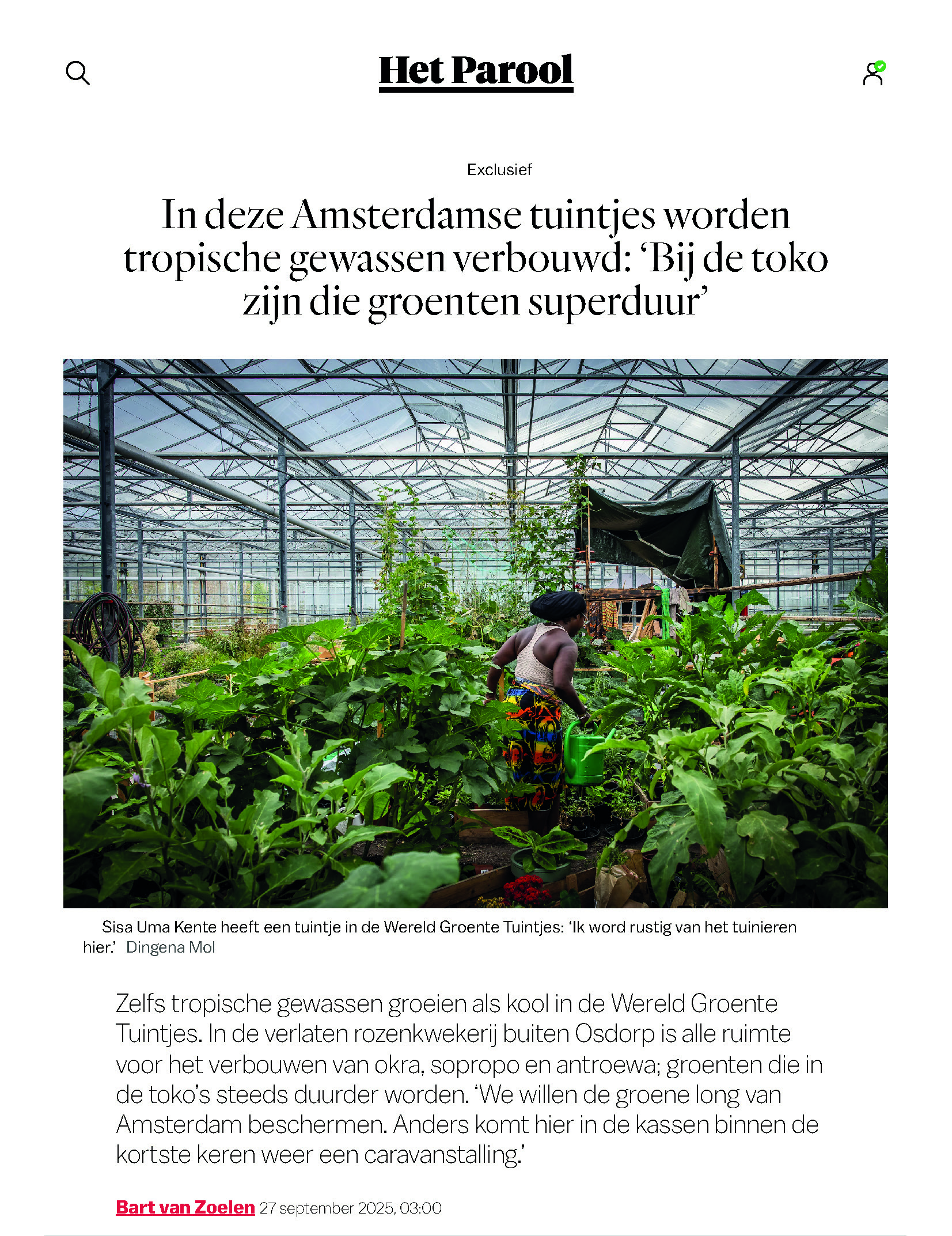 Lees hier het leuke Parool artikel met Christel, Kenneth, Ivette, Sima over hun kostgrondjes, okra’s, postelein, sopropo, klimspinazie, volle boodschappentassen en dat alles in de groene long van Amsterdam bij de Wereld Groente Tuintjes. Fotografie door Dingena Mol.